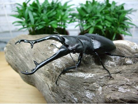 分布地: 印尼介紹:長頸鹿鋸鍬形蟲是世界上最長的鍬型蟲,最大可以達120mm。其身型巨大且瘦長,細長的大顎佔總長的一半左右,愈巨大的個體愈有發達的大顎。它是飼育非常普及的鍬形蟲,在飼養上最重要的是要注意他們有沒有確實進食,避免因獨特彎曲的大顎,造成進食上的困難。