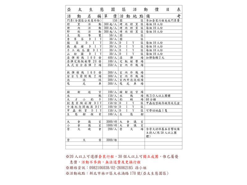 亞太生態園區活動價目表~